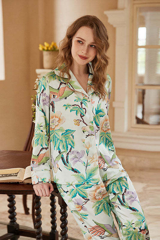 Indulge in elegance with this luxurious pajama set featuring a regal floral pattern. Crafted from silky ice-silk fabric. it offers a smooth. lightweight feel perfect for spring and autumn. The long-sleeve design combines comfort and sophistication. making it an ideal choice for relaxing in style.