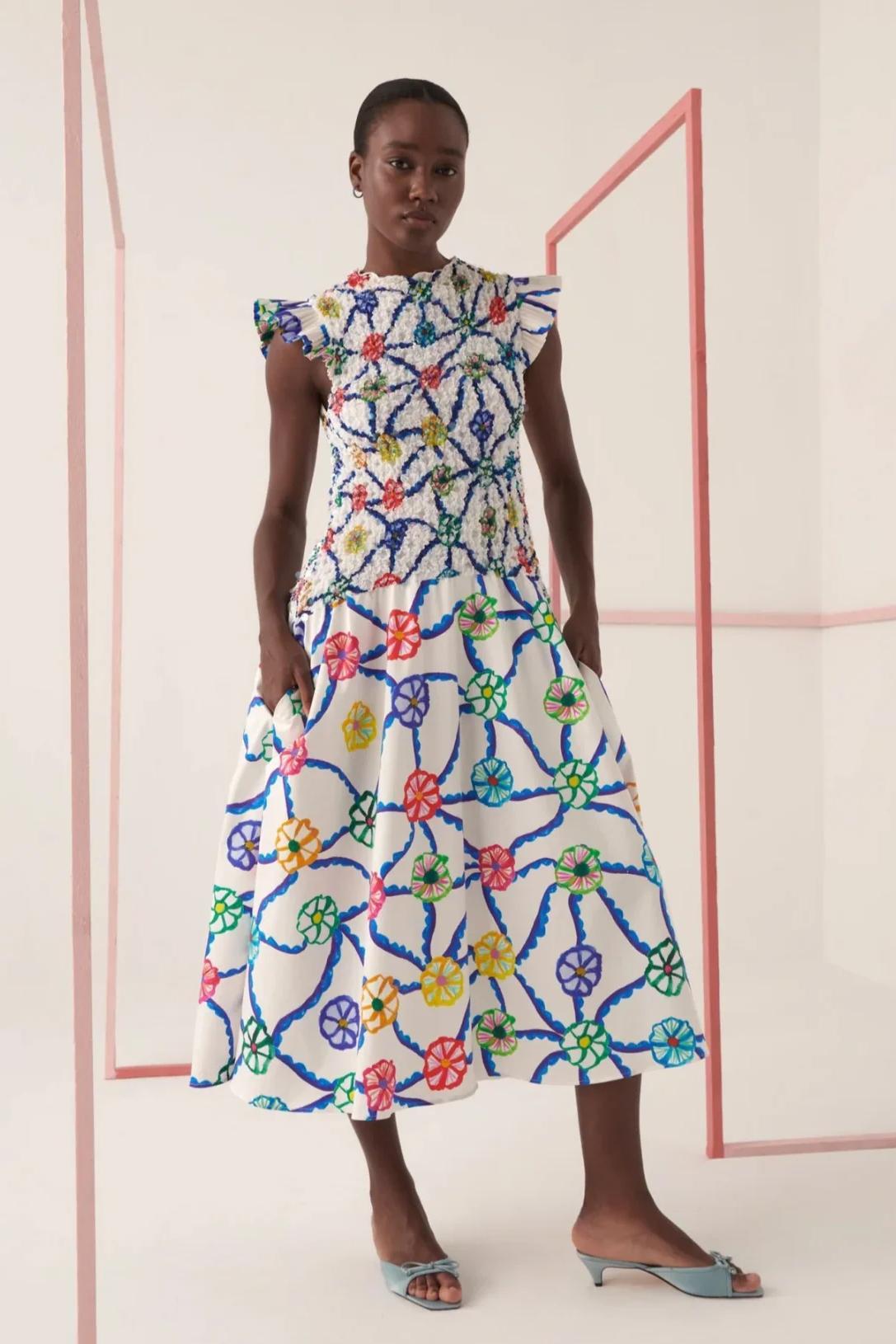 This vibrant midi dress features an all-over colorful floral print on a white base. exuding a fresh and lively vibe. The high neckline is accented with delicate ruffled details on the shoulders. adding a feminine touch. The fitted bodice flows into a flared skirt that moves gracefully with every step. while side pockets offer practicality without compromising style.