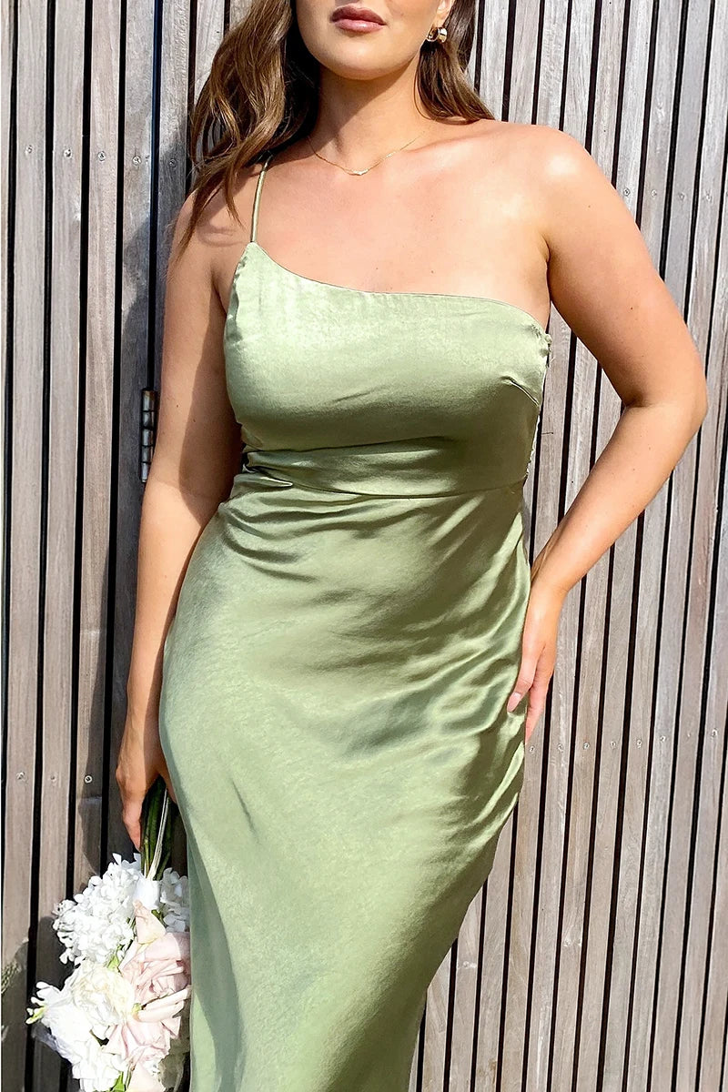 This dress features a stunning asymmetrical one-shoulder design with a single thin strap. creating a sleek and modern silhouette. The invisible side zipper ensures a seamless fit. while the silky look and feel add an elegant touch.