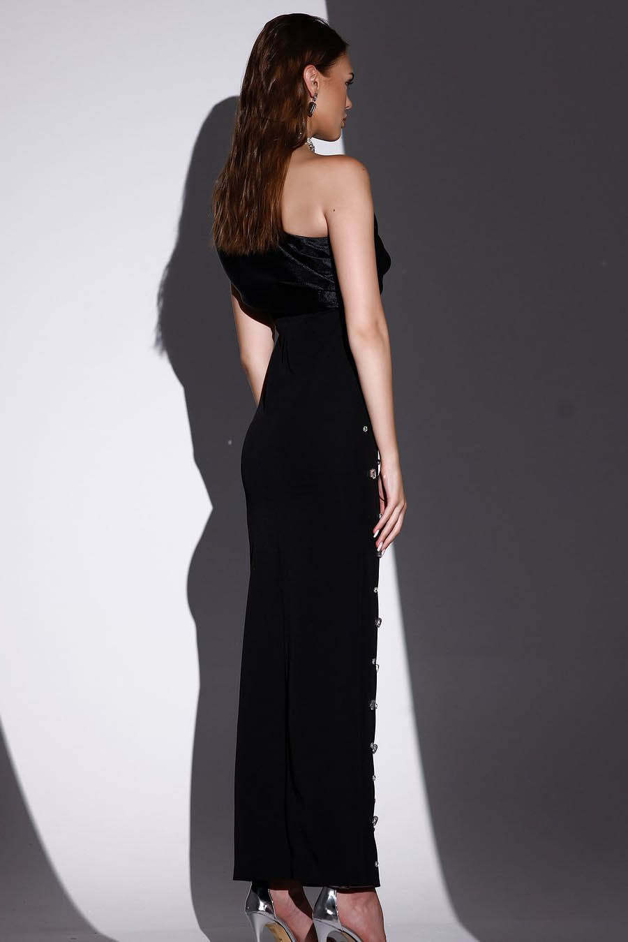 This high-end European-style dress features a graceful bodycon silhouette with sparkling rhinestone accents. The off-shoulder design and refined stitching make it perfect for upscale evenings and formal events.