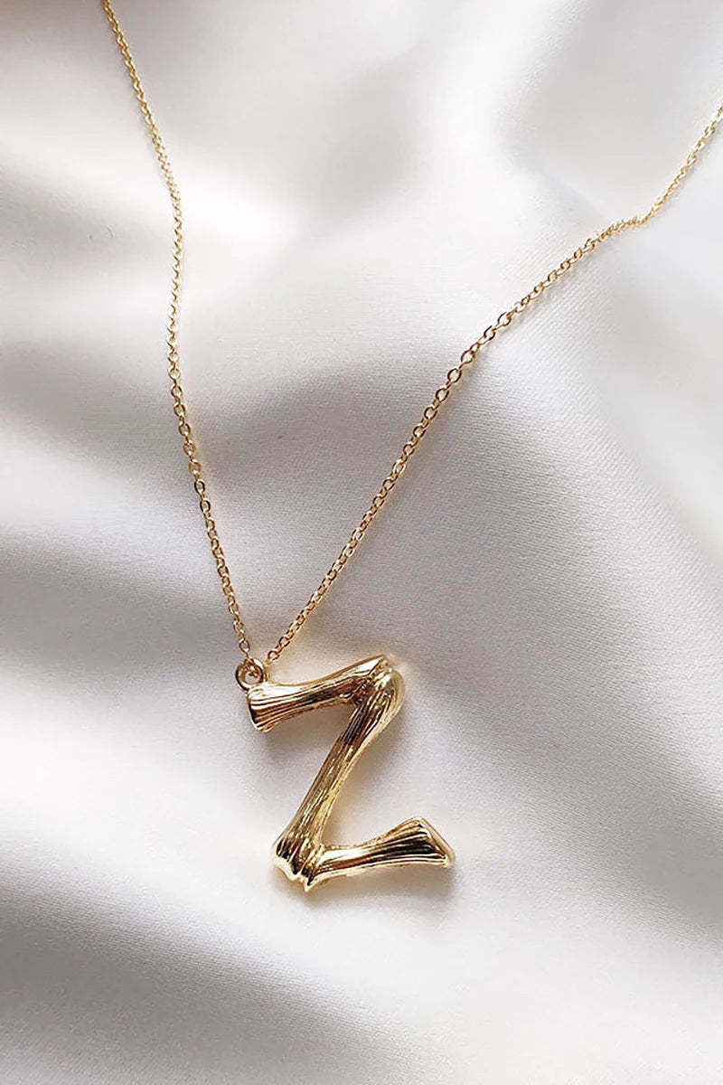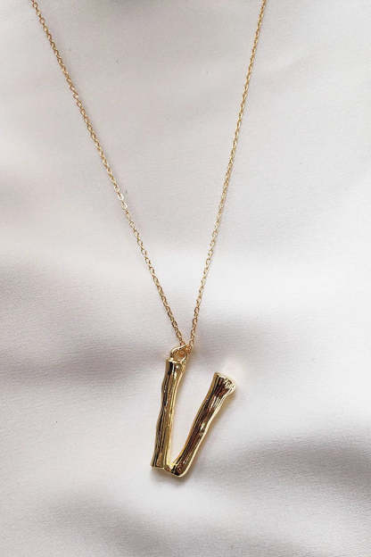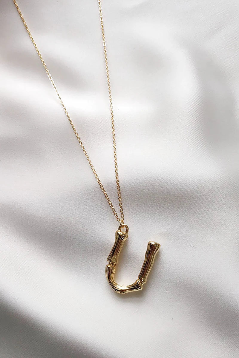 Enhance your style with our Fine Chain Gold Necklace featuring a distinctive letter pendant. Crafted in the shape of bamboo stalks. the pendant measures approximately 2cm x 3cm. offering a unique and elegant touch. This necklace is perfect for layering. with two adjustable chain lengths: the shortest at around 26cm and the longest at about 30cm.