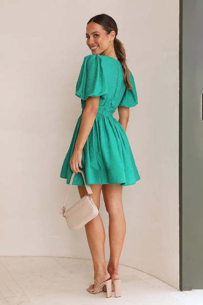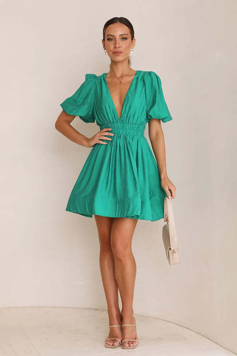 Elevate your style with the Sophia Dress. designed for a sophisticated and contemporary look. Featuring half balloon sleeves and a deep V neckline. this dress exudes modern elegance. The double hook and eye fastening on the bust ensures a secure fit. while the thick. elasticated waistband highlights your figure.