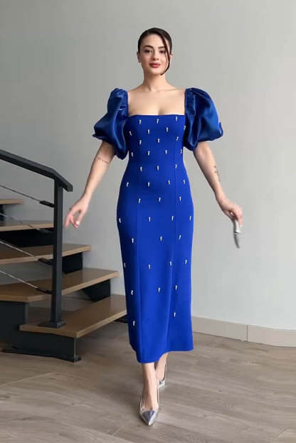 This vintage-inspired polka dot long dress features a flattering half-open collar and puff sleeves for a touch of elegance. The slim fit design accentuates your figure. while the back slit adds a hint of allure. Perfect for both casual outings and special occasions. it combines timeless style with modern sophistication.