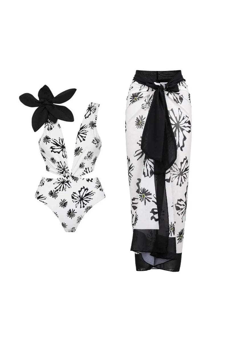 Elegant and eye-catching. this white one-piece swimsuit features delicate floral appliqués and a soft printed design. The combination of clean white tones and 3D flower details adds a romantic and high-end touch to your summer style.