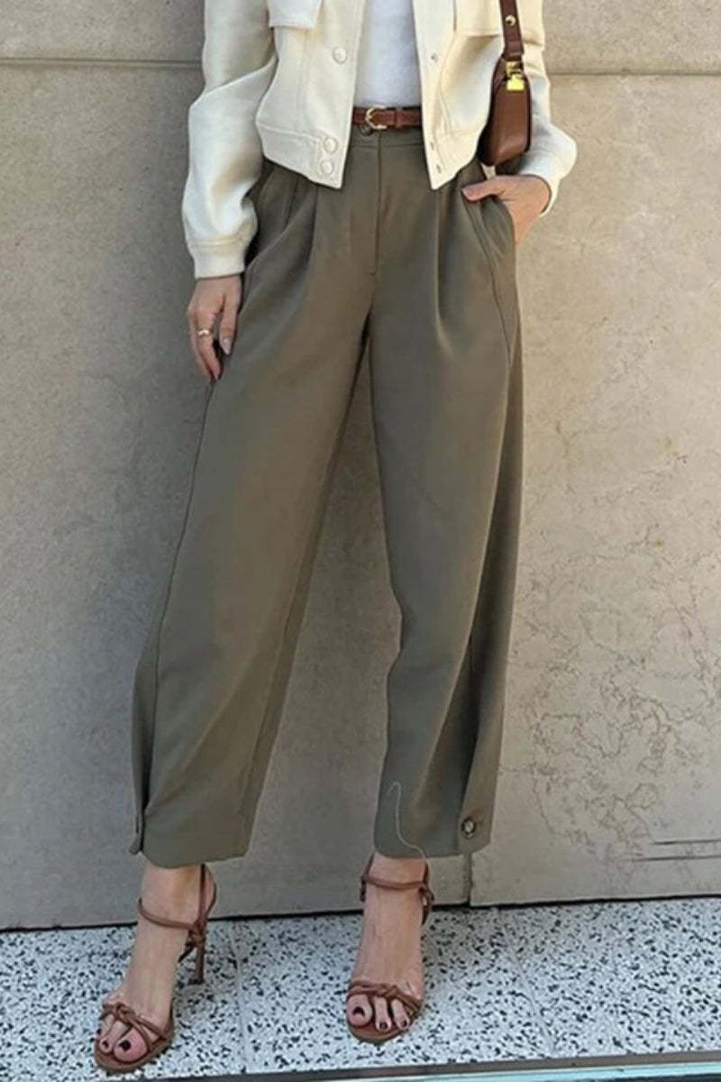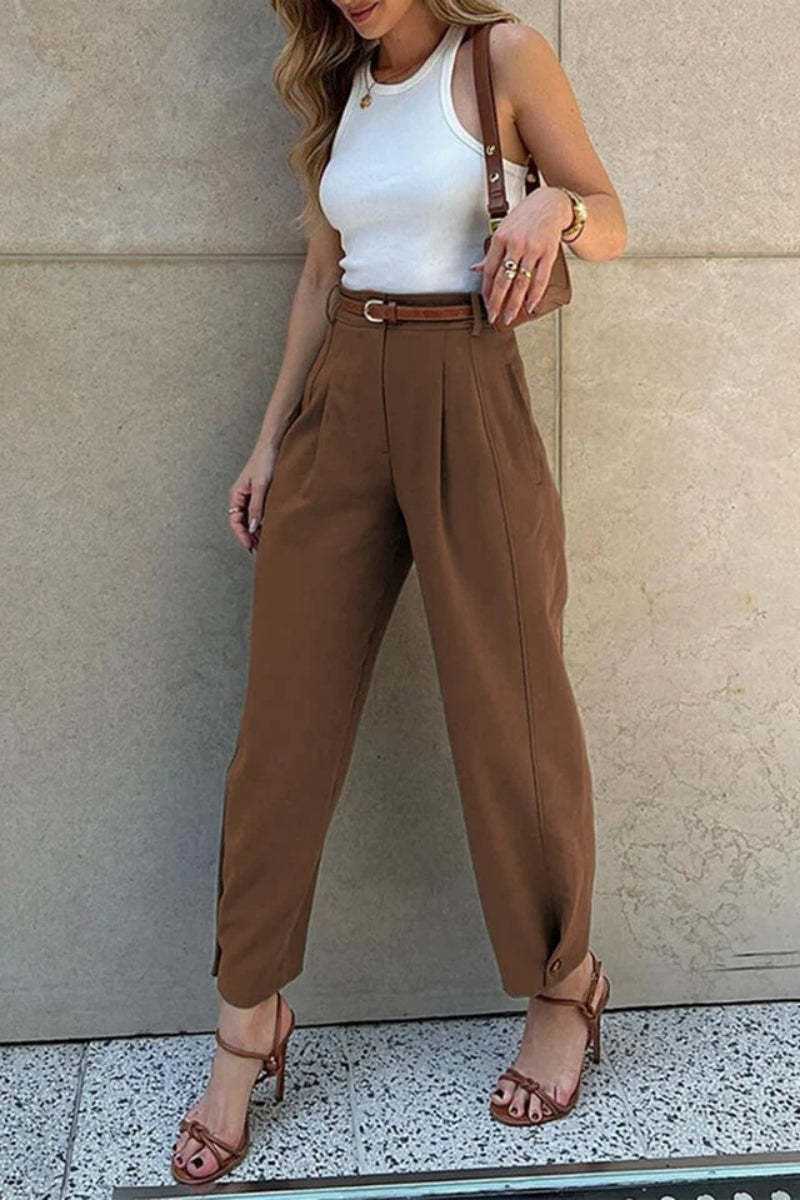 Transform any outfit into a sophisticated. luxurious statement piece with these stylish. loose-fitting. high-waisted cuffed suit pants.