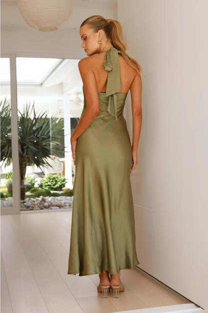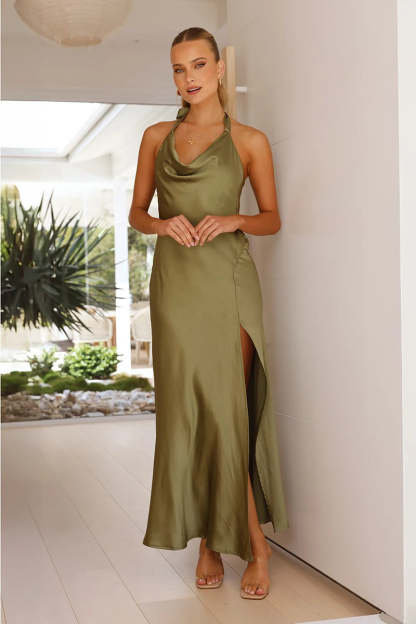 Elevate your evening style with our Sian Dress. a true embodiment of sophistication. Featuring a halter style with a tie detail at the back and a luxurious cowl neckline. this dress exudes elegance. The satin-look material enhances its glamour. while the side split adds a touch of allure to the classic maxi length.