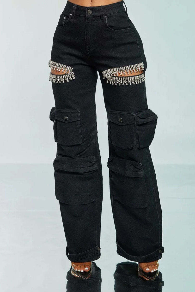 Discover unparalleled comfort and fashion-forward style with our updated cargo pants. now featuring spandex for a flexible and flattering fit. These pants boast sophisticated rhinestone accents on the mid-leg openings. adding a touch of sparkle to your ensemble. Complete with practical side pockets and a form-fitting silhouette. they are a must-have for any chic wardrobe. Stay on-trend and elevate your daily wardrobe with these striking cargo pants. High waist. Form-fitting waist and hips. Wide leg.
