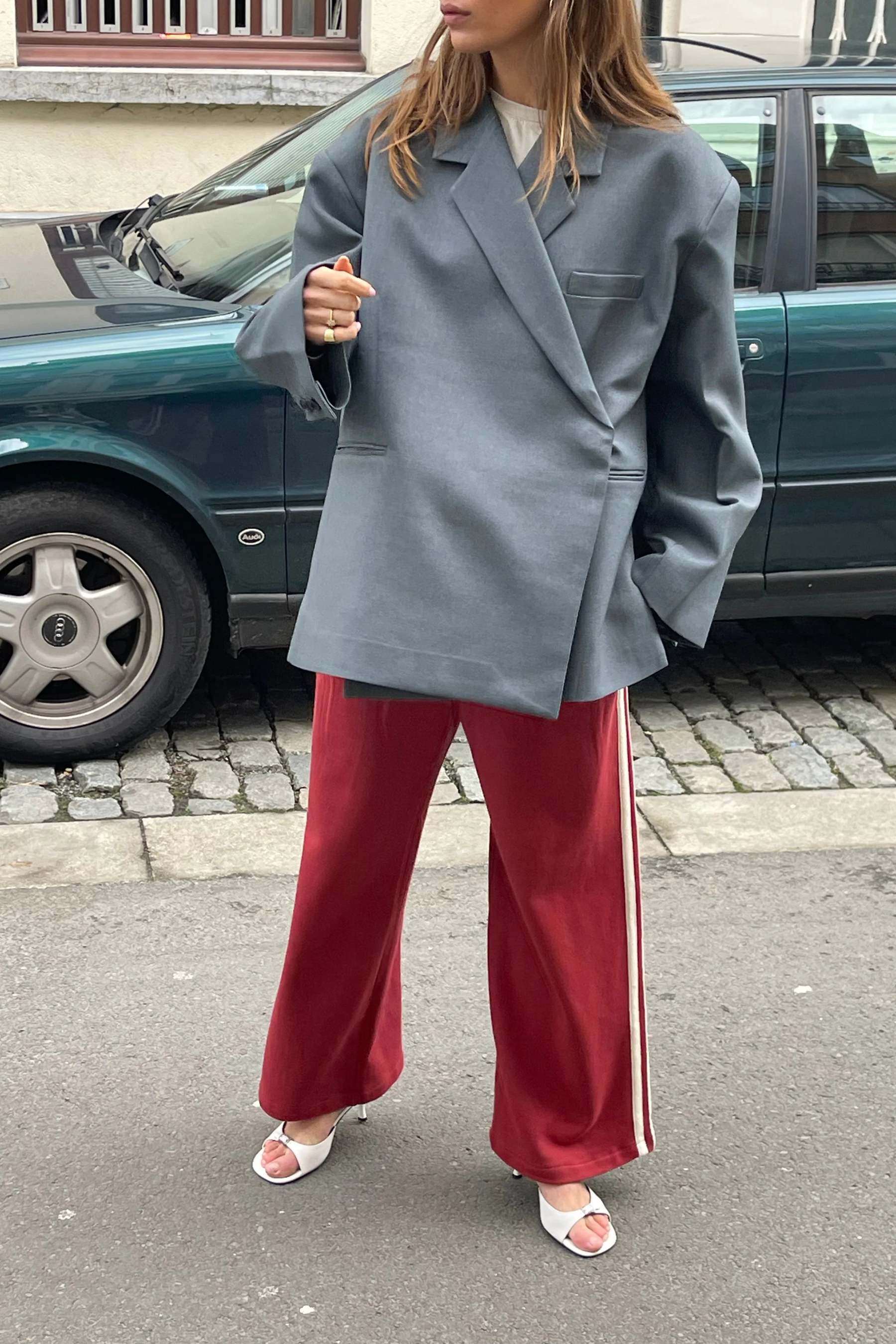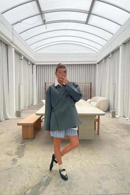 This blazer features a classic lapel collar and side slits. adding a modern touch to the timeless design. With a loose fit and practical pockets. it's perfect for a comfortable yet polished look suitable for work or casual outings.