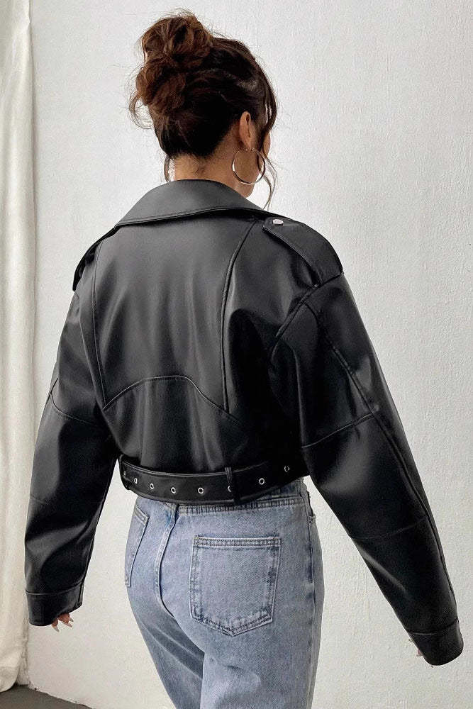 Stand out with this Asymmetrical Zipper Belted Leather Jacket. The unique diagonal zipper and belted waist create a bold. edgy look. Its cropped design and classic lapel collar add a touch of modern sophistication. perfect for a chic. rebellious style.