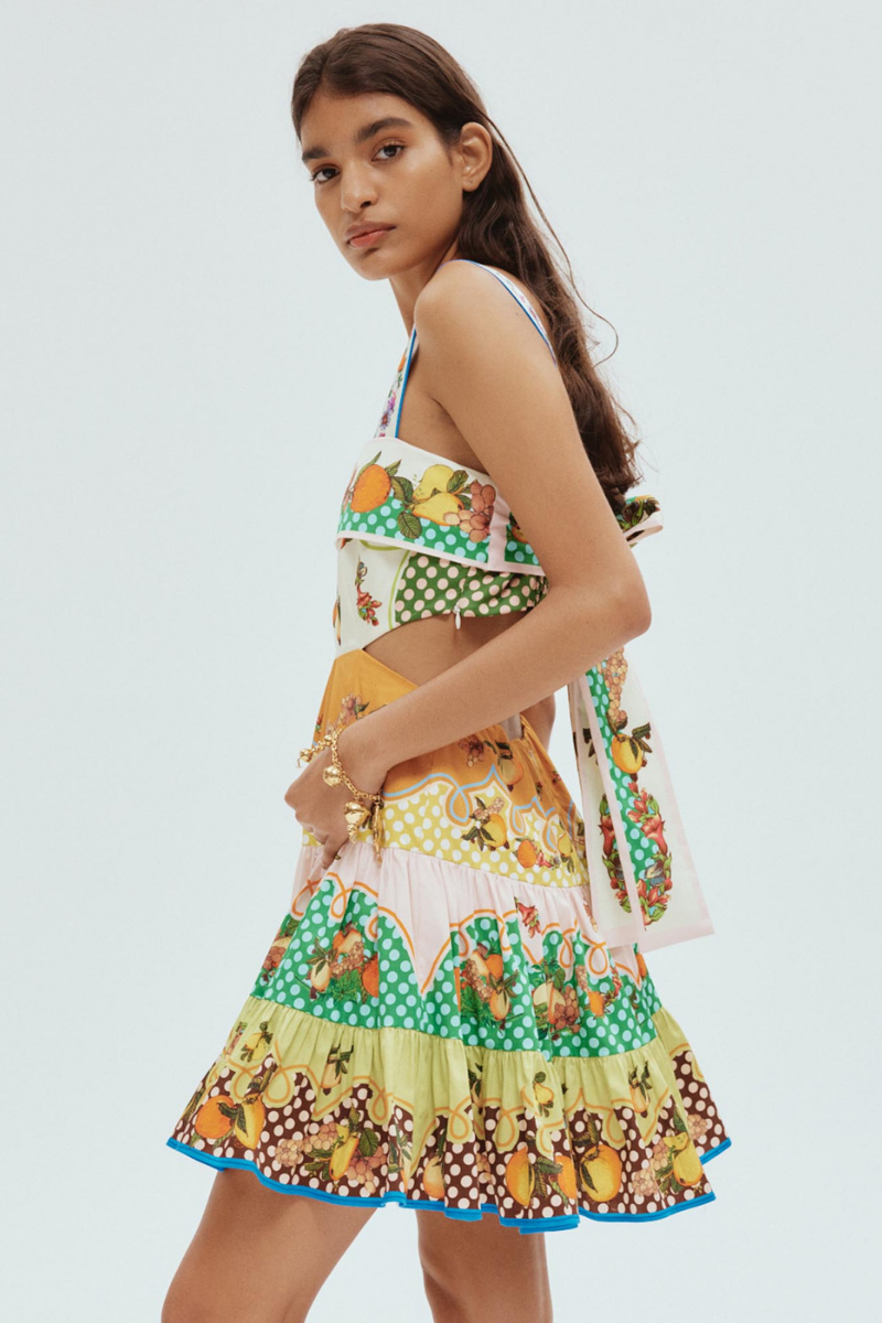 This chic sleeveless dress combines casual style with a trendy. modern twist. Featuring a gathered waist and tie detail. the dress accentuates your figure while the cropped. mid-length design adds a bold. playful touch. The vibrant print and unique cut make it perfect for making a fashion-forward statement.