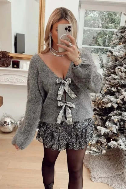Embrace French elegance with this loose-fitting cardigan featuring a V-neckline and sparkling sequin bow detail. Crafted for a relaxed fit. this long-sleeve sweater combines chic style with comfort. The shimmering bow adds a touch of glamour. making it perfect for both casual and slightly dressy occasions.