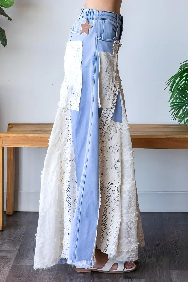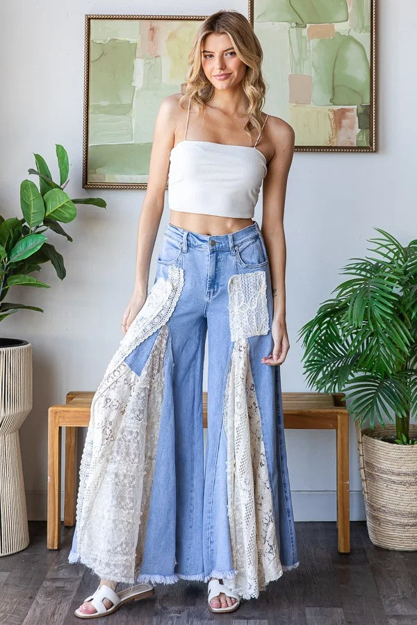 Embrace your inner free spirit with these Lace Insert Denim Flares. a perfect blend of comfort and boho-inspired style. Designed with a relaxed fit that's true to size. they combine classic denim with delicate lace inserts. bringing a fresh. feminine twist to retro flare silhouettes. The stretchy fabric ensures all-day comfort while keeping its shape. making them as easy to wear as they are effortlessly chic.