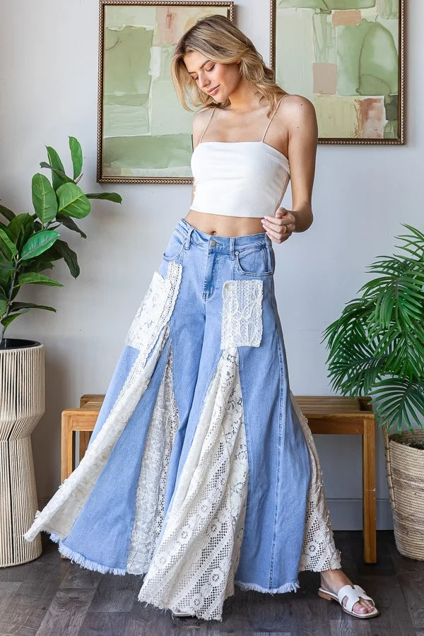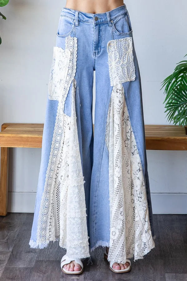 Lace Insert Denim Flare Pants