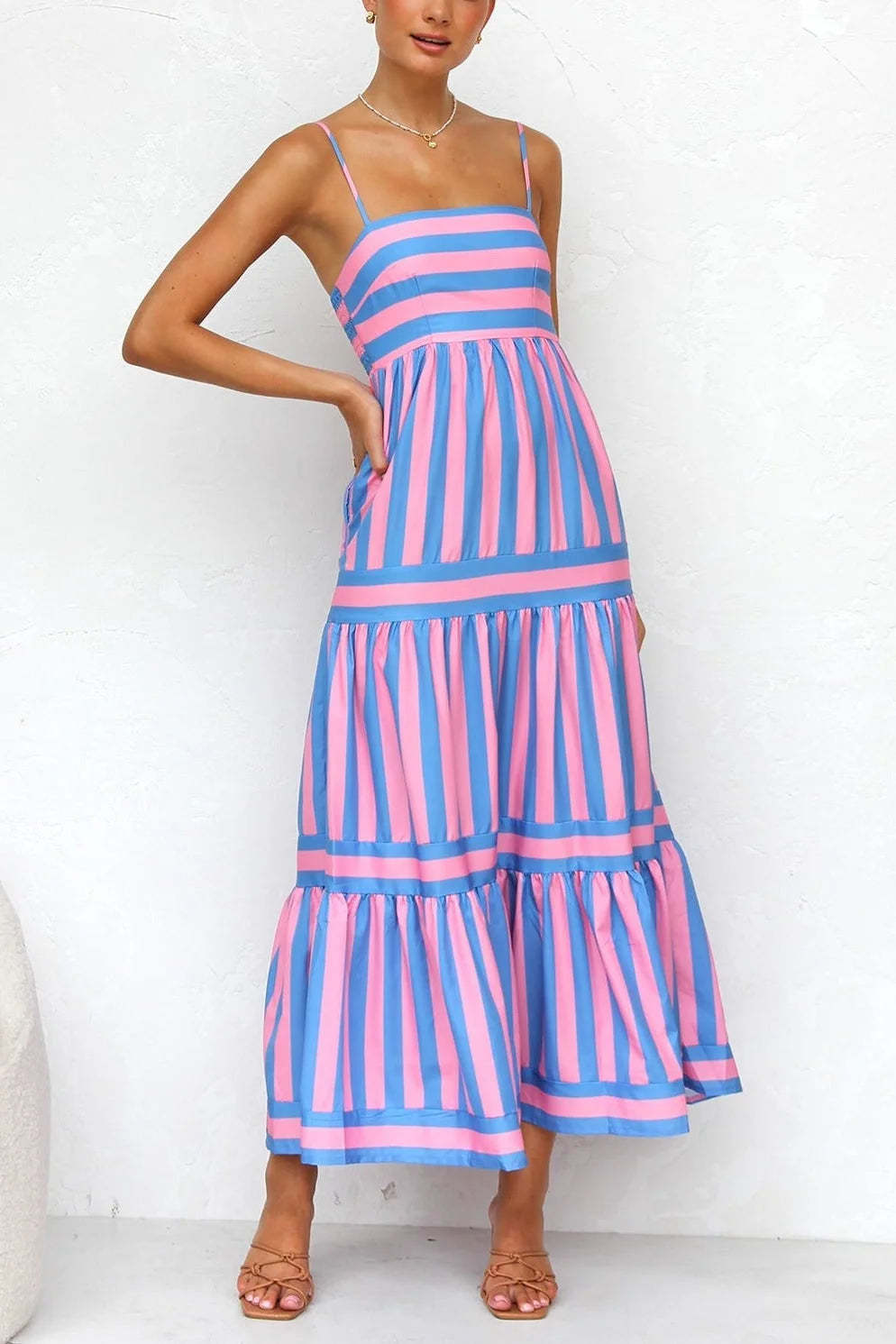 Discover the charm of the Laina Dress in Pink/Blue. featuring a vibrant striped design. This maxi dress combines pink and blue stripes with adjustable spaghetti straps and an elastic shirring back for a tailored fit. The dress flows gracefully from under the bust-line. offering an elegant silhouette.