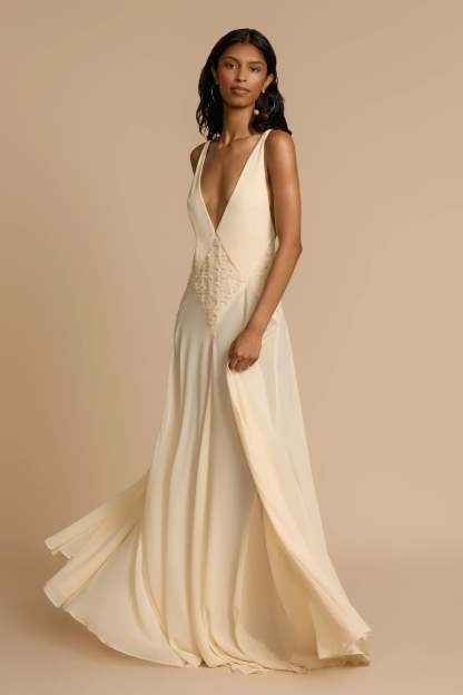 Effortlessly graceful. the Lavinia Dress is designed for the modern muse. Featuring a plunging V-neckline adorned with delicate lace accents. this gown exudes romance and sophistication. The adjustable straps meet at the back. creating a striking open-back design that enhances its sensual appeal. Flowing into a soft. ruched maxi skirt. this dress moves with elegance and ease. perfect for intimate celebrations or dreamy getaways.
