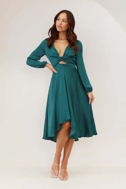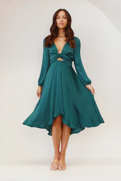 Make a statement at your next special event with our stunning satin-feel dress. designed to embody elegance and femininity. The high-low skirt creates a graceful silhouette. while the tight waistband cinches the waist for a flattering fit. With a 2-way adjustable front tie. this dress allows you to customize your look. making it a versatile choice for various body shapes and sizes.