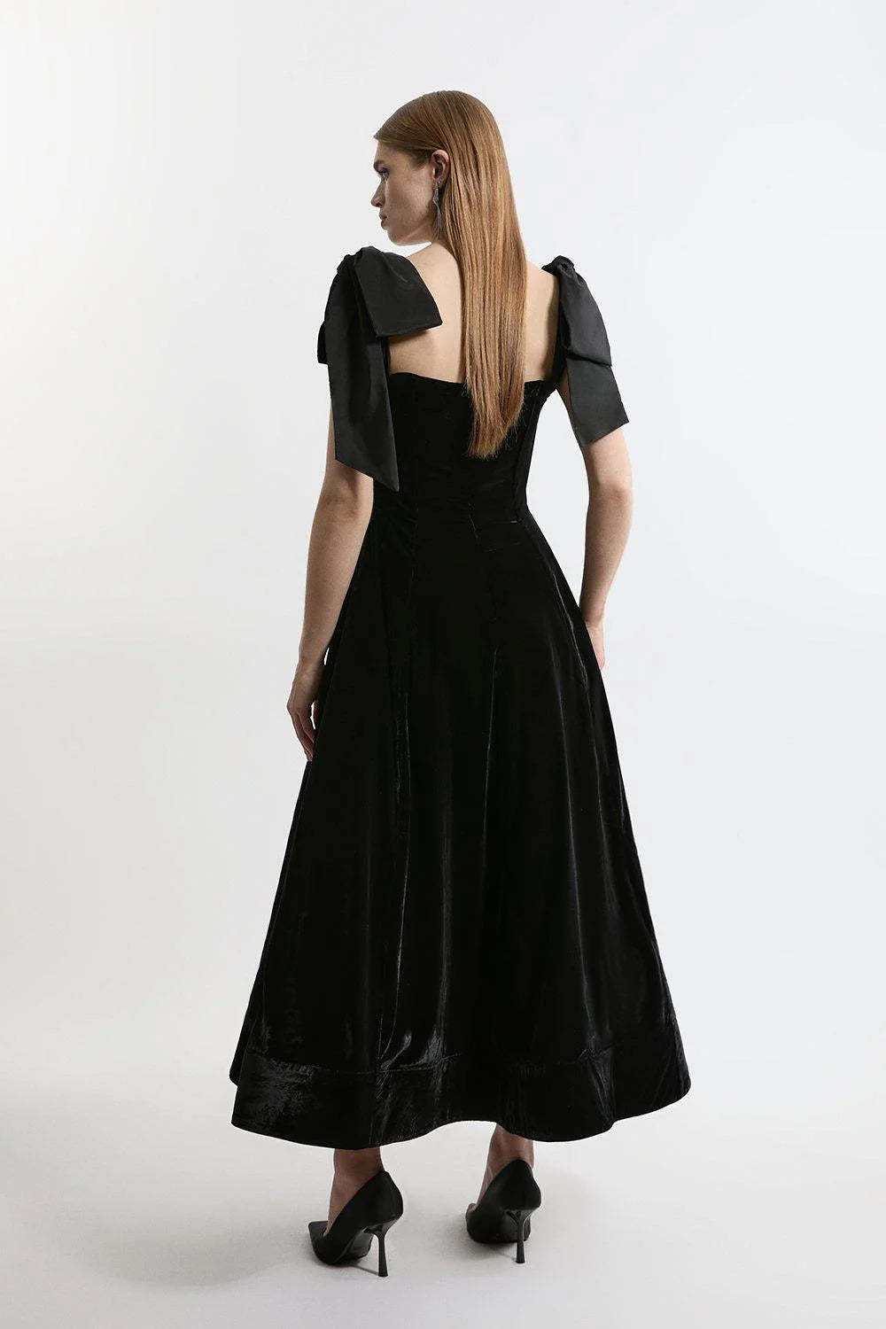 Add romance to your wardrobe with this Velvet Strapless Bow Midi Dress. Crafted from a luxurious and soft fabric. it drapes beautifully and reaches the ankle. offering effortless movement. The high waist and fitted hips create a flattering silhouette. while the flat bandeau neckline and contrasting bow straps bring an extra touch of femininity. Perfect for special occasions. pair it with strappy heels for an elegant evening look.