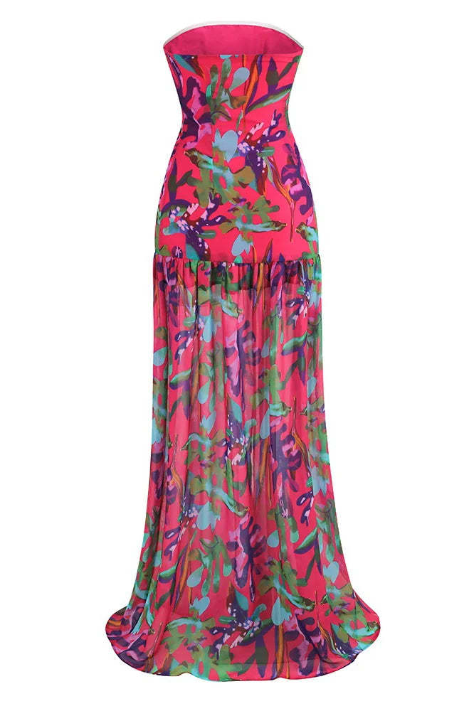 Stun in the Pam Printed Strapless Slit Maxi Dress. designed for a modern chic look. Featuring a vibrant hot pink abstract print. this chiffon dress showcases a strapless neckline and a daring slit. making it ideal for your next glamorous event. Embrace the spotlight and make a bold statement in this stunning piece!