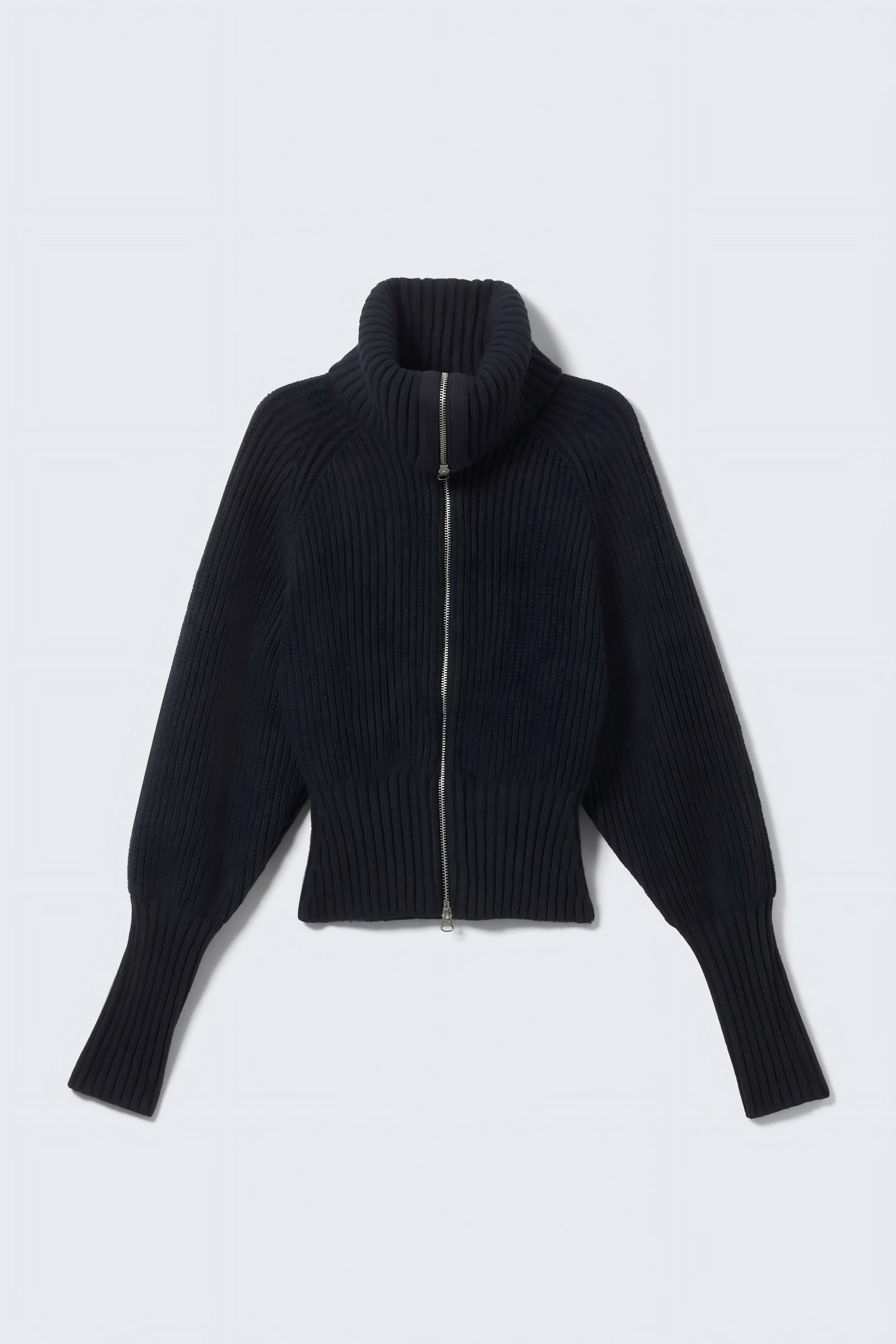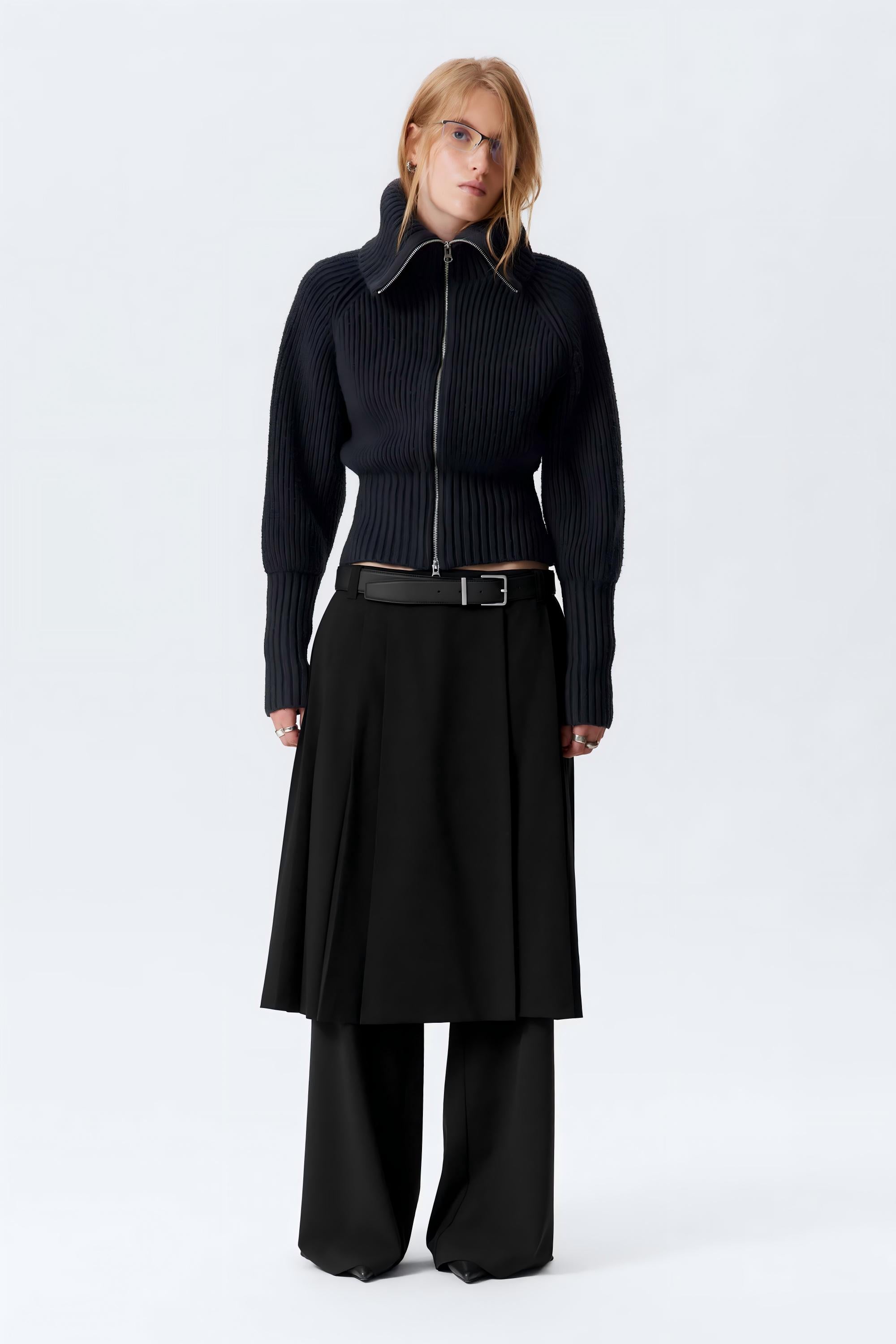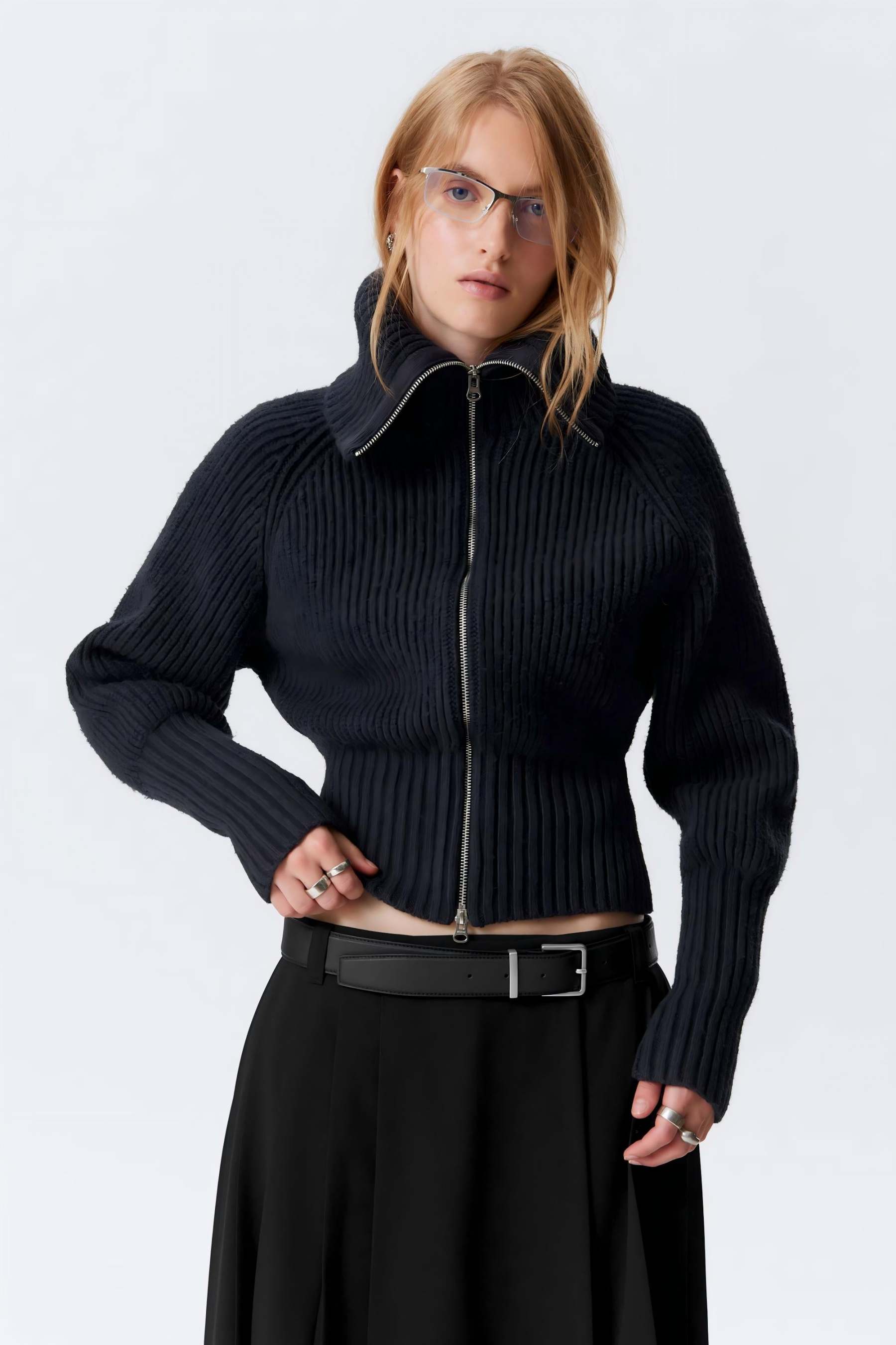 Refined simplicity meets modern structure in this Slim Fit Ribbed Zip Cardigan. a versatile layer designed to elevate everyday style. The rib-knitted construction sculpts a sleek silhouette. while its slim fit adds a polished edge to any look. Featuring a high stand collar. raglan sleeves. and a two-way zip front. it blends function with understated sophistication. Extended ribbed cuffs and hem provide definition and texture. and the discreet inner zip guard ensures a clean. comfortable finish.
