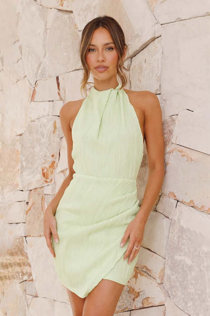 Turn heads in the Sophia Mini Dress. where classic elegance meets contemporary design. This mini-length dress features a high neckline with a two-button closure. adding a touch of sophistication. The pleated textured fabric and gathered detailing with a crossover front create a flattering silhouette. while the open back style adds a modern edge.