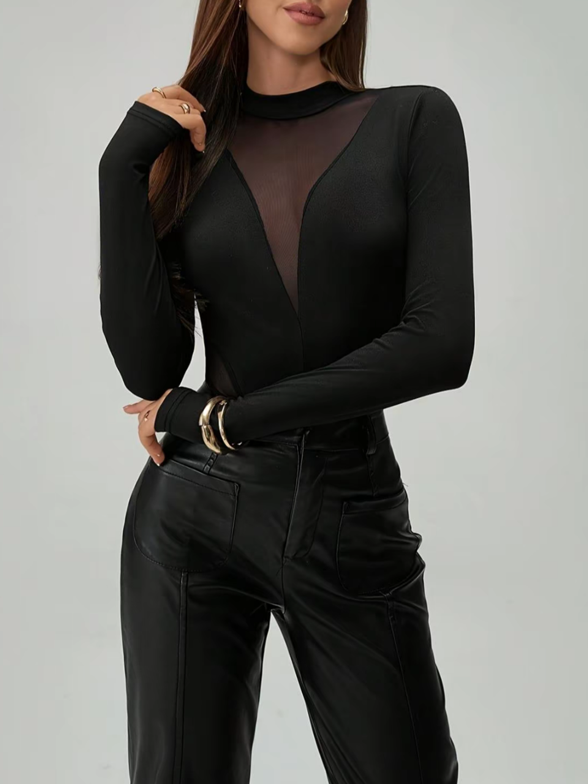 Women's See Through Mesh High Neck Long Sleeved Triangle Bodysuit