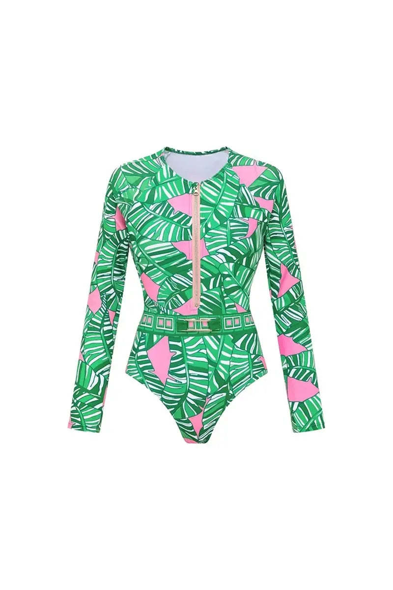 Green Zip Long Sleeve Printed Surf Swimsuit Set