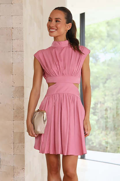 This chic mini dress features a sophisticated high neck design and a sleeveless silhouette. perfect for showcasing your style. The elasticated waistband at the back ensures a comfortable fit. while the stylish waist cut-out detail adds a contemporary twist.