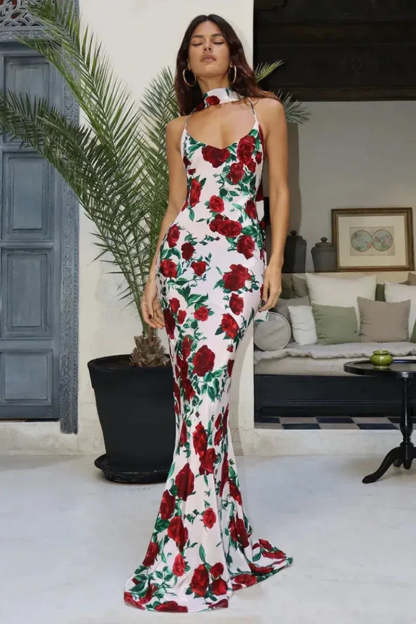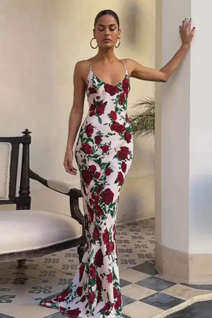 Silk and elegance intertwine to create unforgettable moments. This dress exudes femininity and perfectly embodies beauty and style. This elegantly printed floor-length open-back dress is perfect for dinners and parties.
