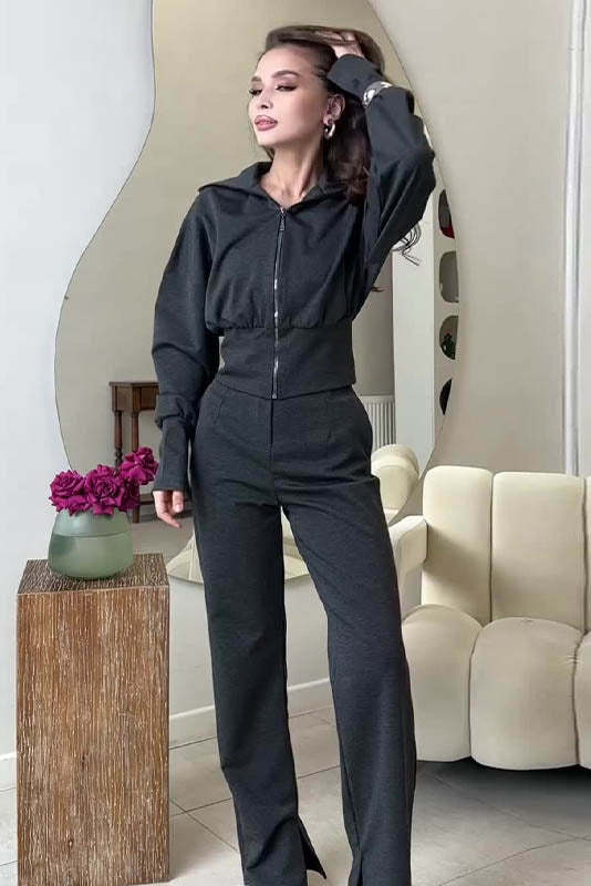 This sleek two-piece set includes a tailored black collared top with a cinched waist for a flattering fit. paired with relaxed wide-leg trousers. The minimalist design blends structure and comfort. perfect for both casual outings and polished everyday wear. A versatile choice for modern wardrobes.