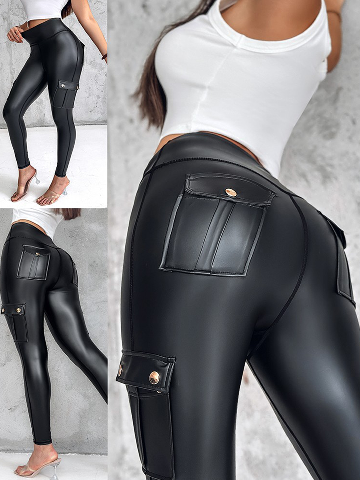 Women's Leather Pants High Waist Cargo Pockets Elasticated Leather Leggings
