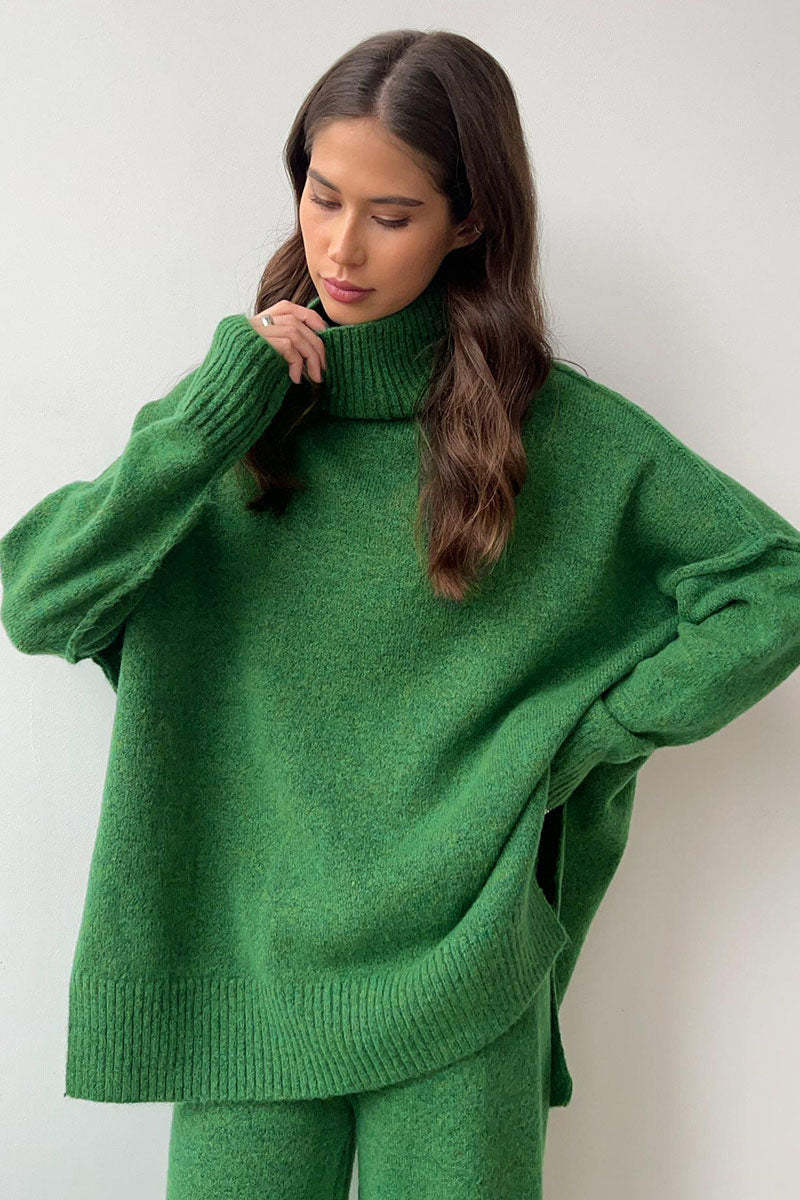 The Turtleneck Split Sweater Loose Knit Pants Set is the ultimate combination of cozy sophistication and relaxed style. Featuring a high-neck sweater with a chic split design and loose-fit. wide-legged knit pants. this set offers a luxurious yet comfortable outfit perfect for lounging or casual outings. The soft. breathable fabric keeps you warm and cozy. while the modern design adds a touch of elegance to your laid-back look.