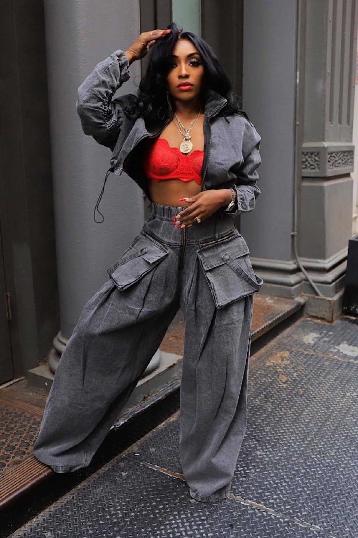 • Design: Two-piece set with wide-leg denim pants and matching top for a coordinated look.