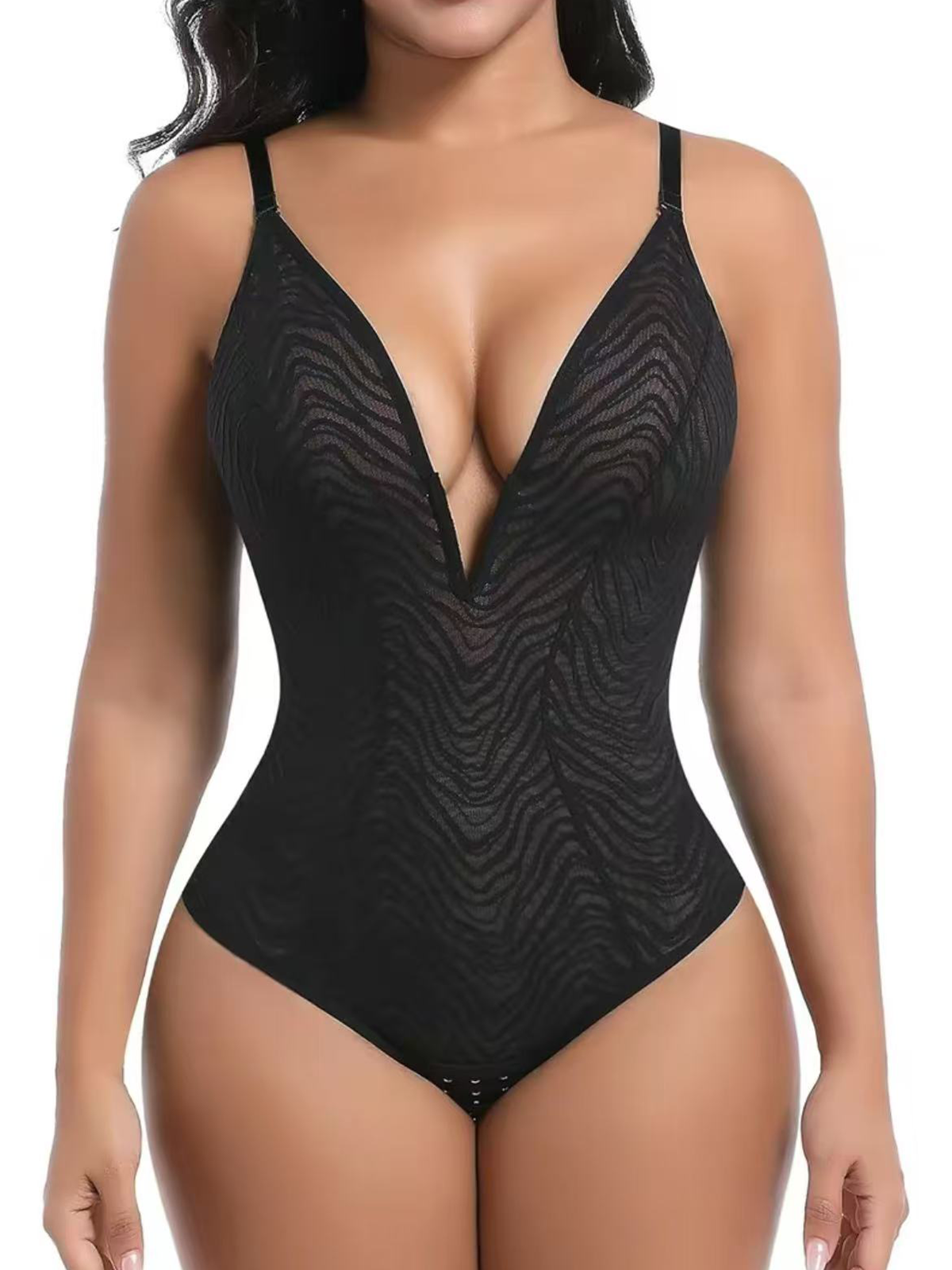 Deep V Neck Sheer Mesh Tummy Control Thong Bodysuit
