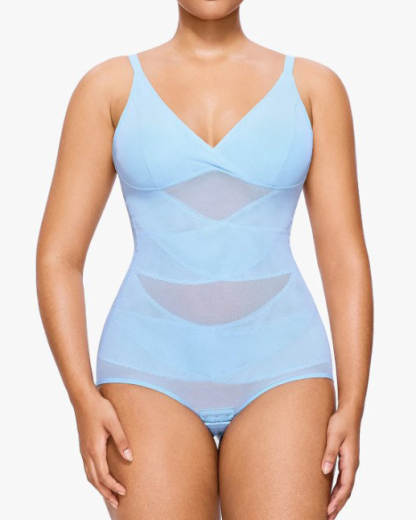 Deep V Neck Sheer Mesh Tummy Control Thong Bodysuit