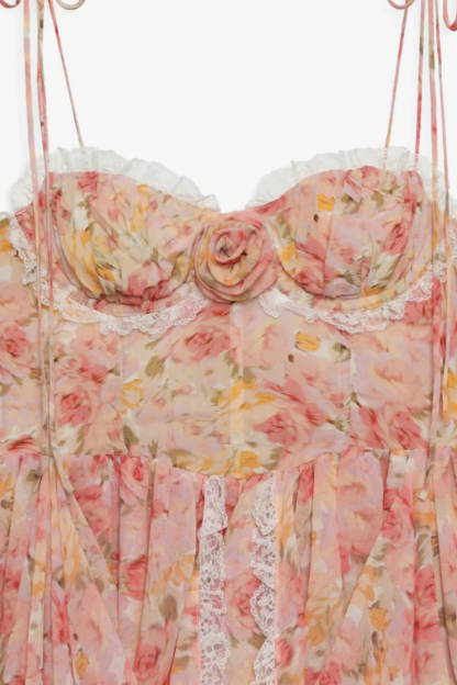 Romantic and full of movement. the Elea Asymmetrical Mini Dress is made for dreamy summer days. This ultra-feminine piece features a delicate floral print. underwire cups. and a boned bodice for structure and support. The standout. multi-layered gathered skirt is finished with an asymmetrical hem and lace ruffle detailing. while a fabric flower at the bust and an open back with butterfly tie add whimsical charm.
