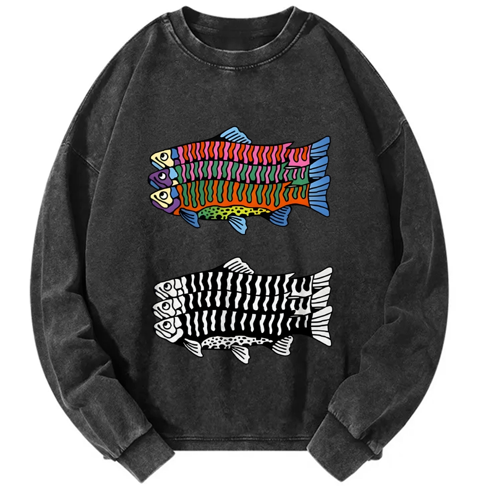Colorful Black And White Fish Printed Vintage Washed Sweatshirts