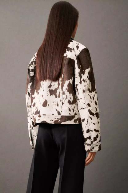 This stylish jacket is crafted from high-quality faux fur fabric. offering a soft and luxurious feel. The design features a unique blend of cow print and animal patterns. bringing a touch of wild elegance to your wardrobe. The straight cut and shirt-style collar combine urban fashion with natural elements. The jacket includes two practical chest pockets with flaps and decorative seams for added flair. The long sleeves come with buttoned cuffs. and the interior is lined for extra comfort and warmth.
