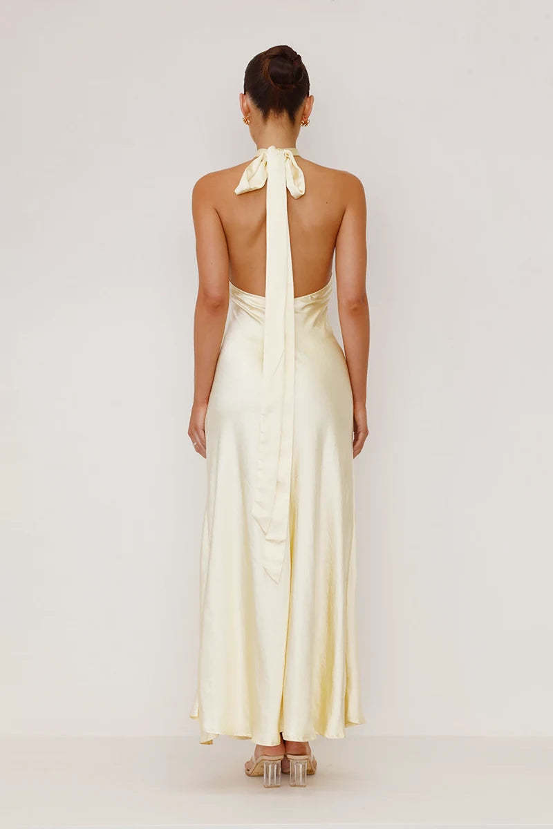 The Amalia Maxi Dress is a stunning addition to your wardrobe. offering both elegance and versatility. Featuring a halter neck with a chic cutout detail and a removable. adjustable neck tie. this dress ensures a personalized fit. The maxi length and side slit add a touch of allure. while the invisible back zipper provides a seamless silhouette.