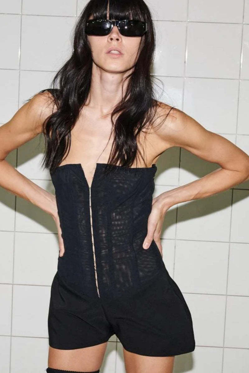 Dark. daring. and impeccably structured — the Dark Intentions Strapless Corset Romper redefines sensual sophistication. Inspired by lingerie and rooted in classic tailoring. this piece features a body-hugging corset bodice with a geometric neckline and metal hook-and-eye closures that trace the front like subtle armor. The fitted top cinches the waist. while loose. subtly ballooned shorts bring softness and movement to the silhouette.