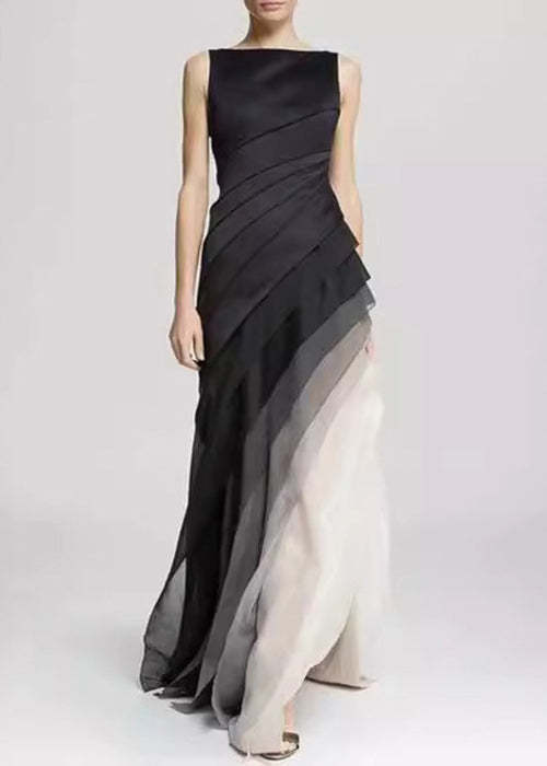 French Black High Waist Patchwork Tulle Maxi Dresses Sleeveless