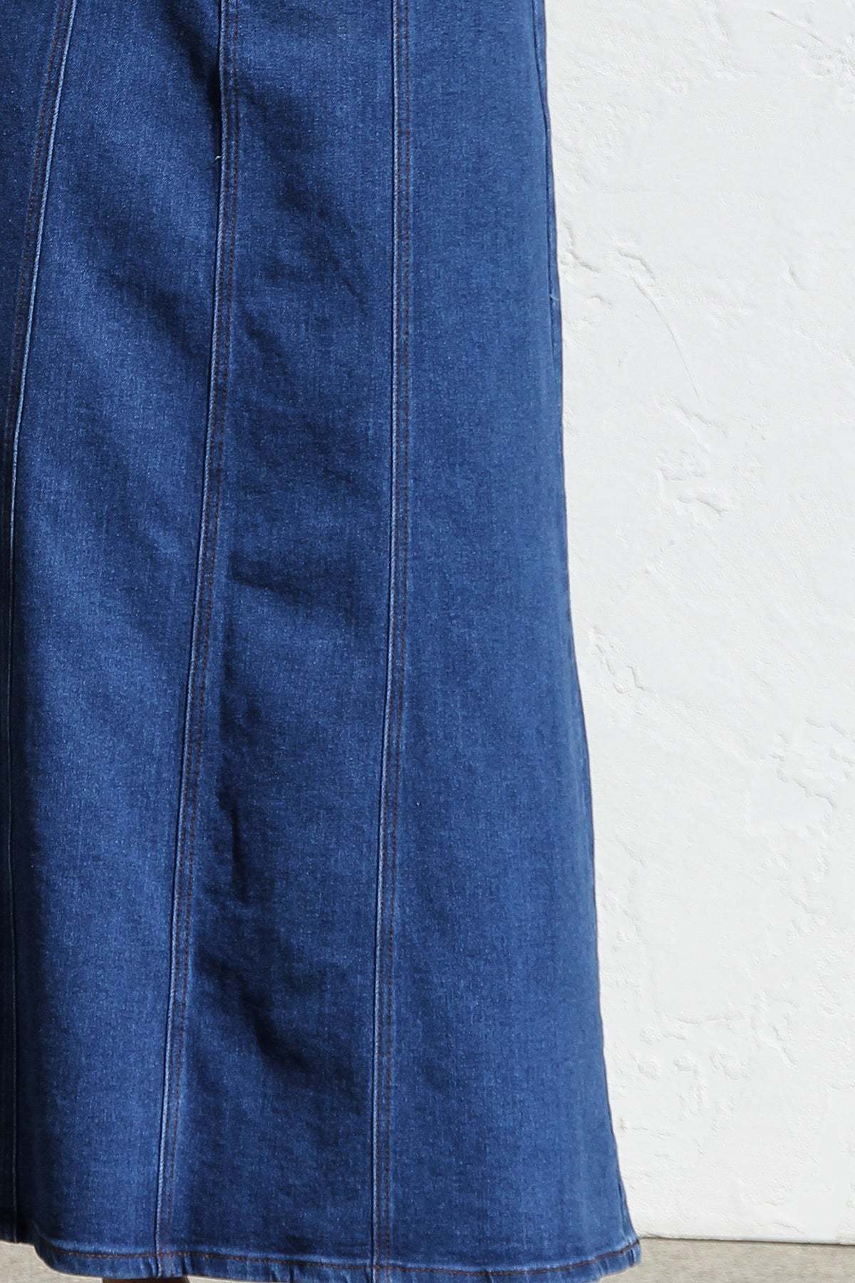 Enhance your wardrobe with this denim A-line maxi skirt. designed for a flattering and stylish silhouette. The vertical seam line panels create a slimming effect. while the front zip and button closure offer a classic touch.