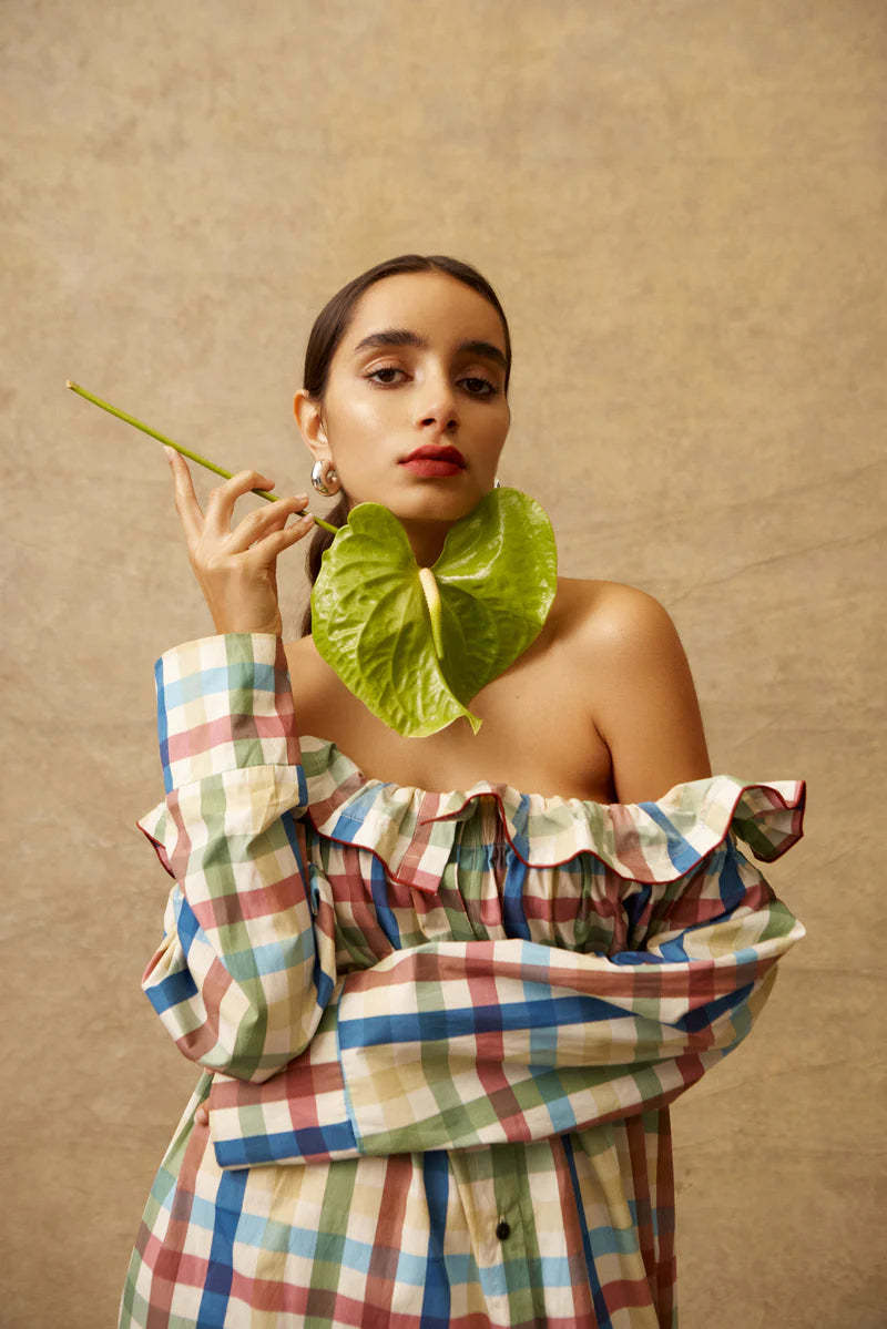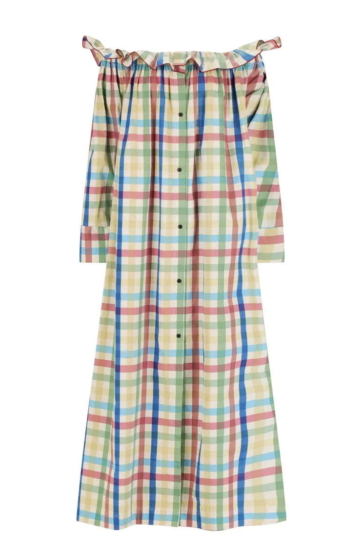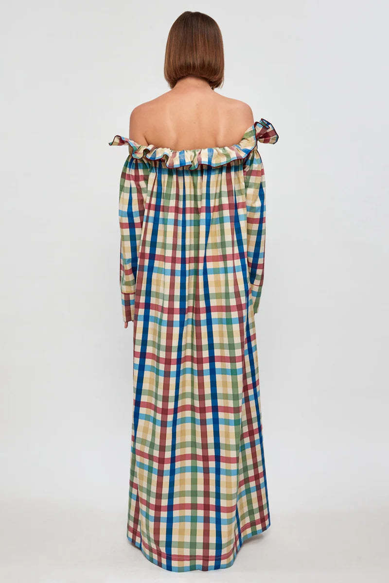 This off-shoulder maxi is all about easy drama. with bold ruffle detailing and a voluminous silhouette. Cut in a playful multicolour check. it brings a punchy twist to laid-back dressing.