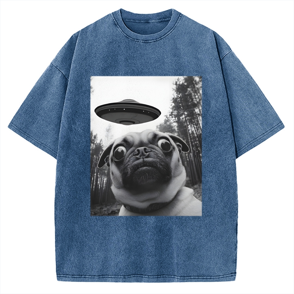 Funny Humor Pug Selfie with Alien UFO Vintage Washed T-shirt