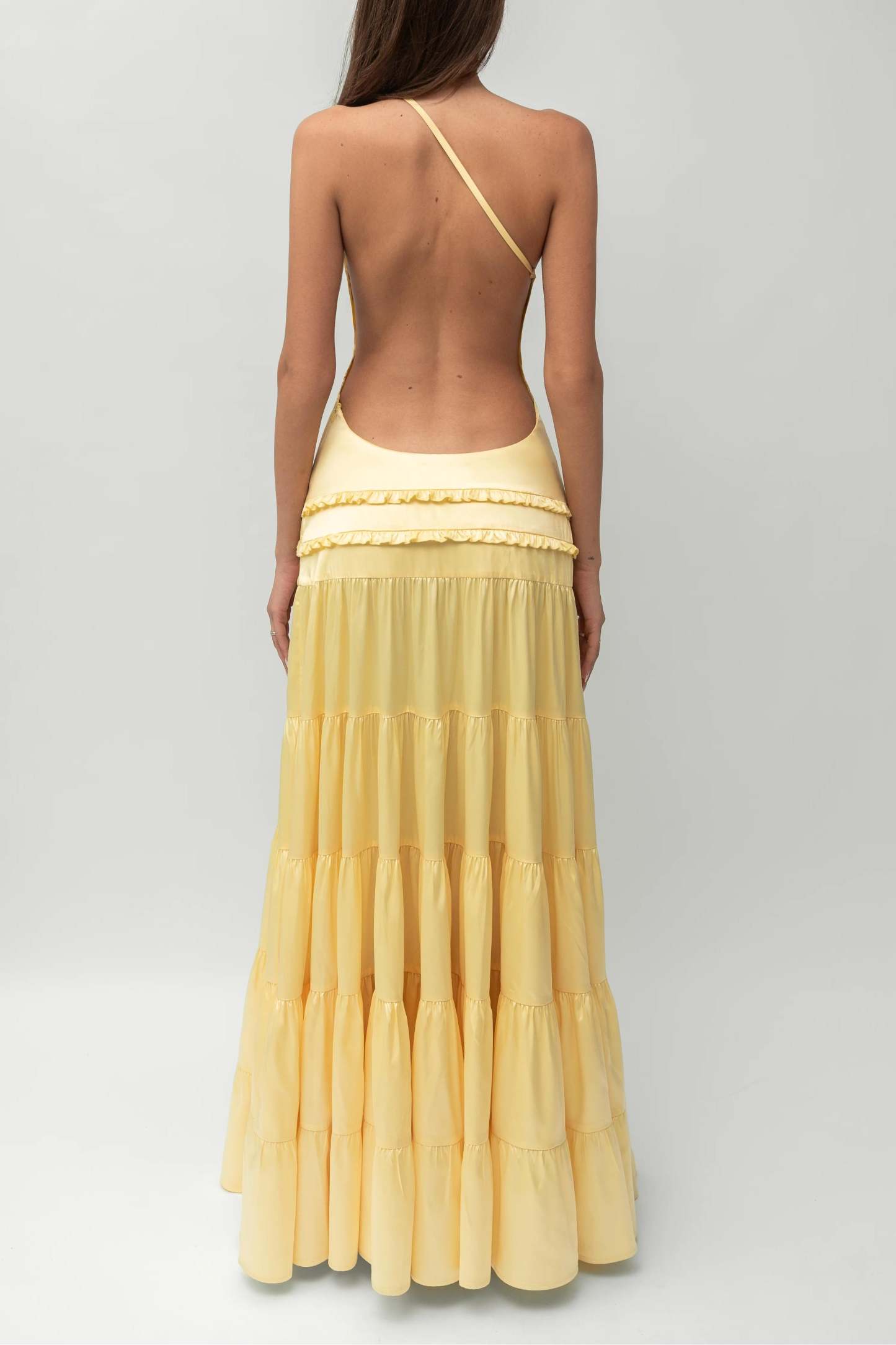 The waist is accented by two layers of soft. cascading ruffles. adding volume and fluidity to the silhouette. A tiered. pleated skirt flows beautifully into a sweeping maxi hem. creating a romantic "cake skirt" effect that moves with ease.