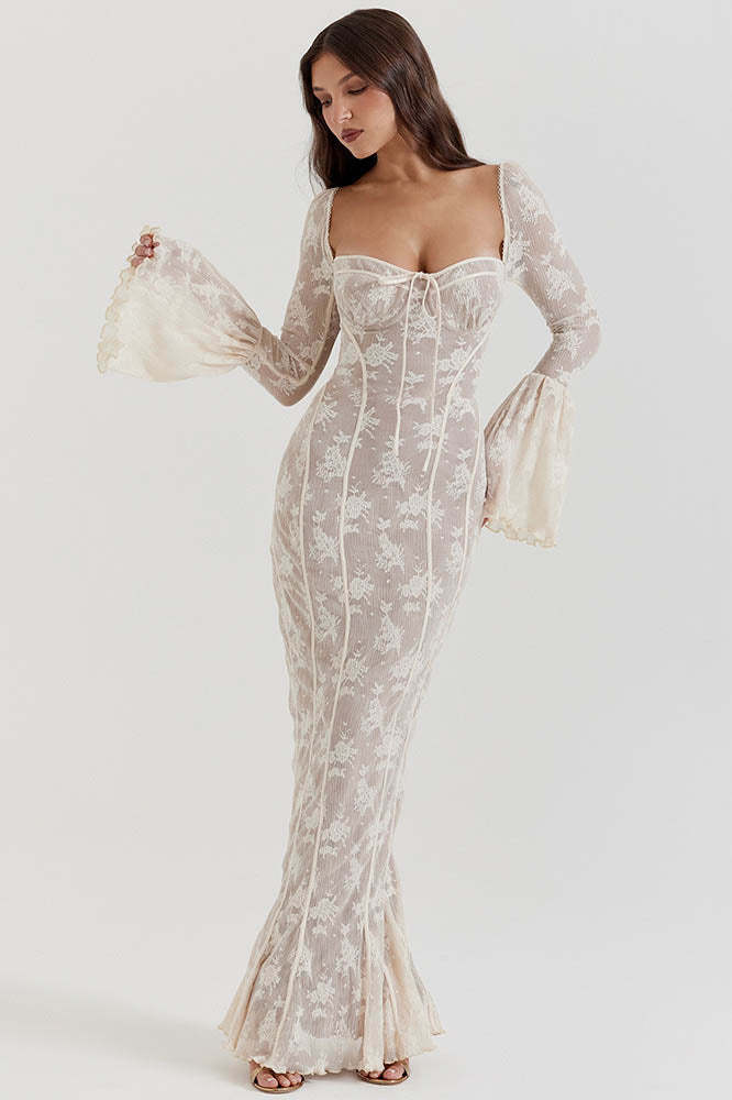 • Design Features: Lace fabric. long sleeves. and an open-back cut